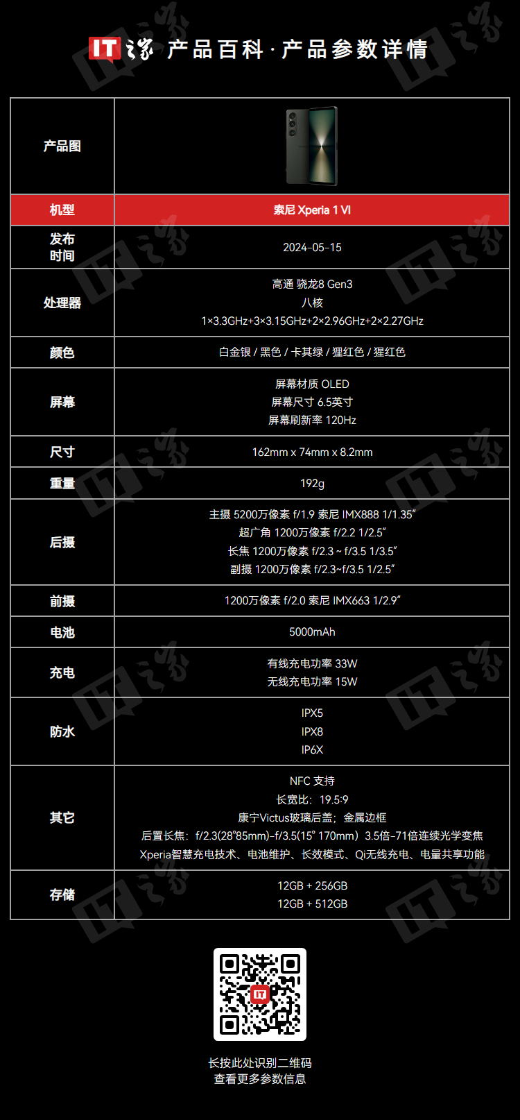 IT之家注:索尼 Xperia 1 系列在 Xperia 1 VI 以前均采用 4K 屏幕,但在 Xperia 1 VI 上索尼摒弃了 4K 屏幕,改为 2340*1080 分辨率的 19.5:9 屏幕。