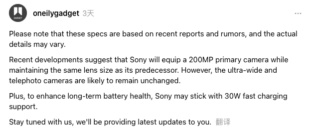 后续 Oneilygadget 称,他的发文基于最近的报道和预测,实际规格可能有所不同;他还表示,索尼也有可能将主摄升级为 2 亿像素,但镜头尺寸与上一代相同,但超广角和长焦规格可能保持不变,在快充功率方面,索尼为长期的电池健康考虑,可能持续使用 30W 的快充规格。