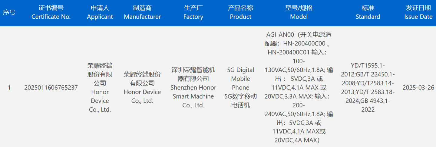 IT之家 3 月 27 日消息,一款型号为 AGI-AN00 的荣耀新机昨日通过了国家 3C 认证,支持 80W 快充。目前这款新机的具体型号还未知。