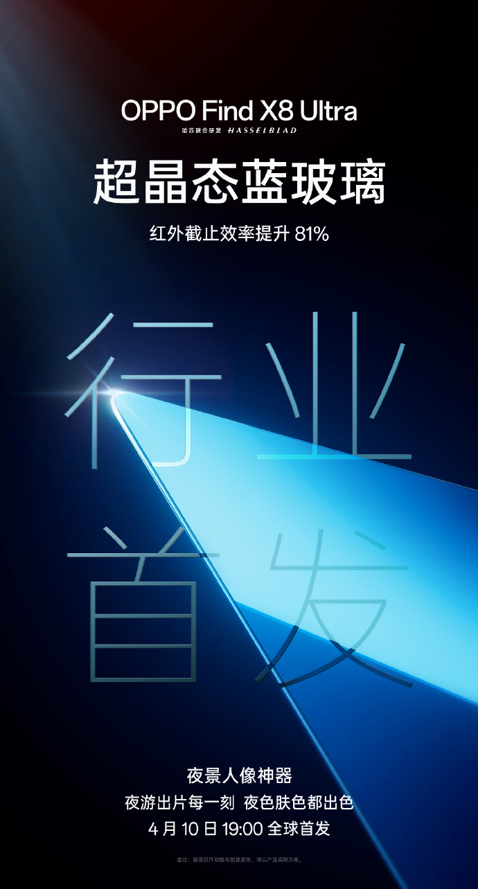 IT之家 3 月 28 日消息,OPPO 今日宣布,OPPO Find X8 Ultra 手机行业首发超晶态蓝玻璃,红外截止效率提升 81%,此外还将搭载行业领先一英寸超大传感器。