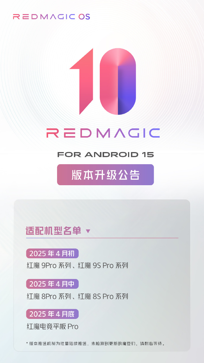 IT之家 3 月 28 日消息,红魔游戏手机今日发布红魔 OS 10.0 更新适配计划公告,陆续适配红魔 9/9S Pro 系列、红魔 8/8SPro 系列、红魔电竞平板 Pro。