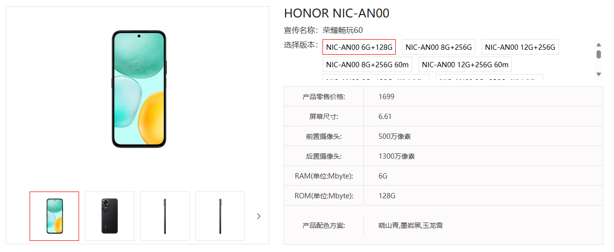 IT之家 3 月 28 日消息,荣耀畅玩 60 手机今日现身中国电信终端产品库并公布外观、配置信息,新机提供晓山青、墨岩黑、玉龙雪三款配色。