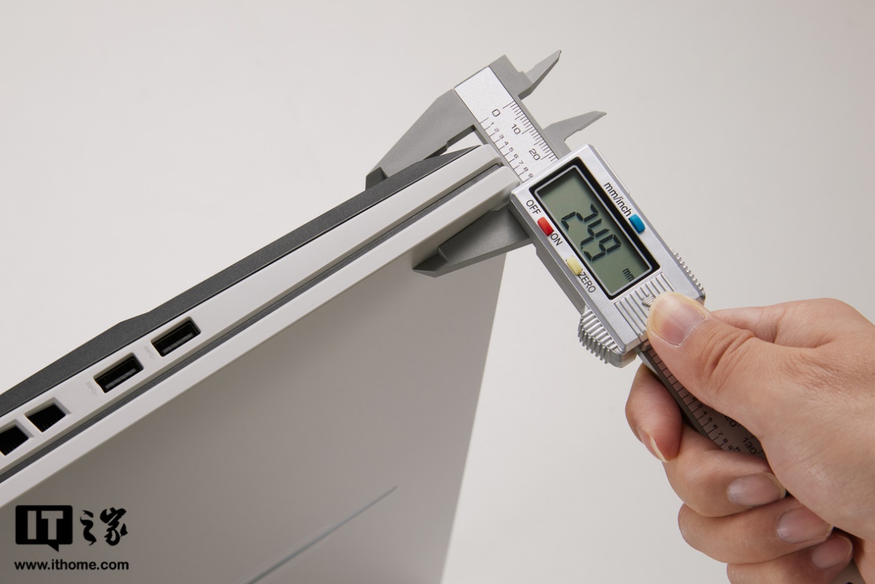 隐星 G16 Pro 作为一台旗舰游戏本,上手比较有分量。体积和尺寸上,经过IT之家实测,其三围分别是 345*255*24.9mm(最大厚度),最薄处为 23mm,裸机重量约 2.7kg。