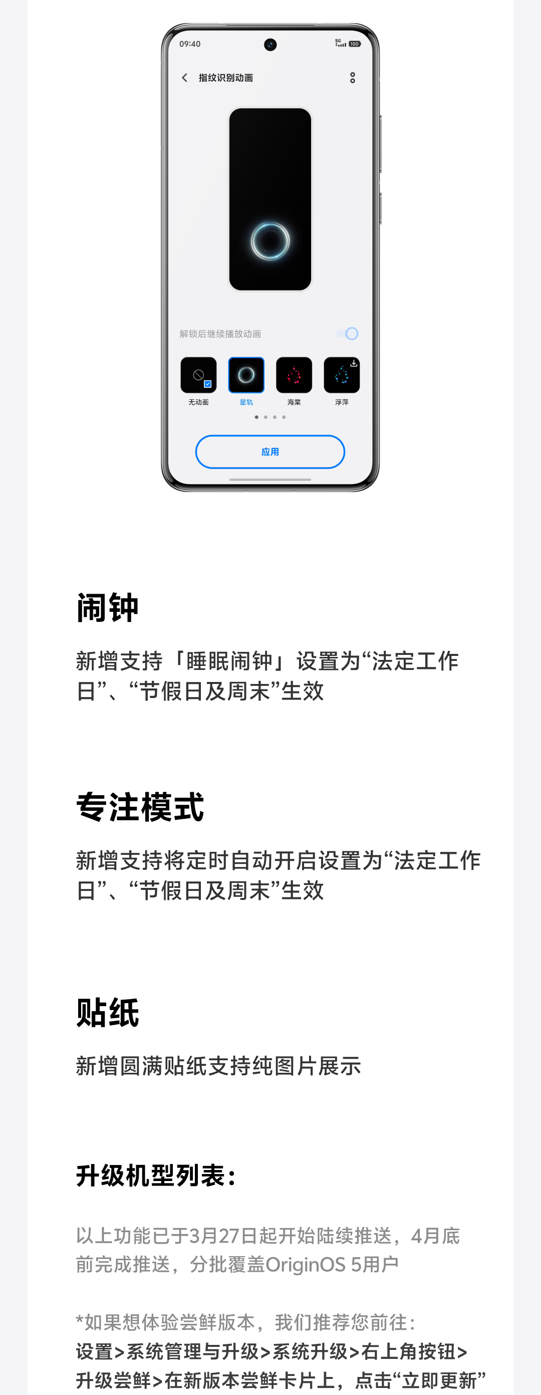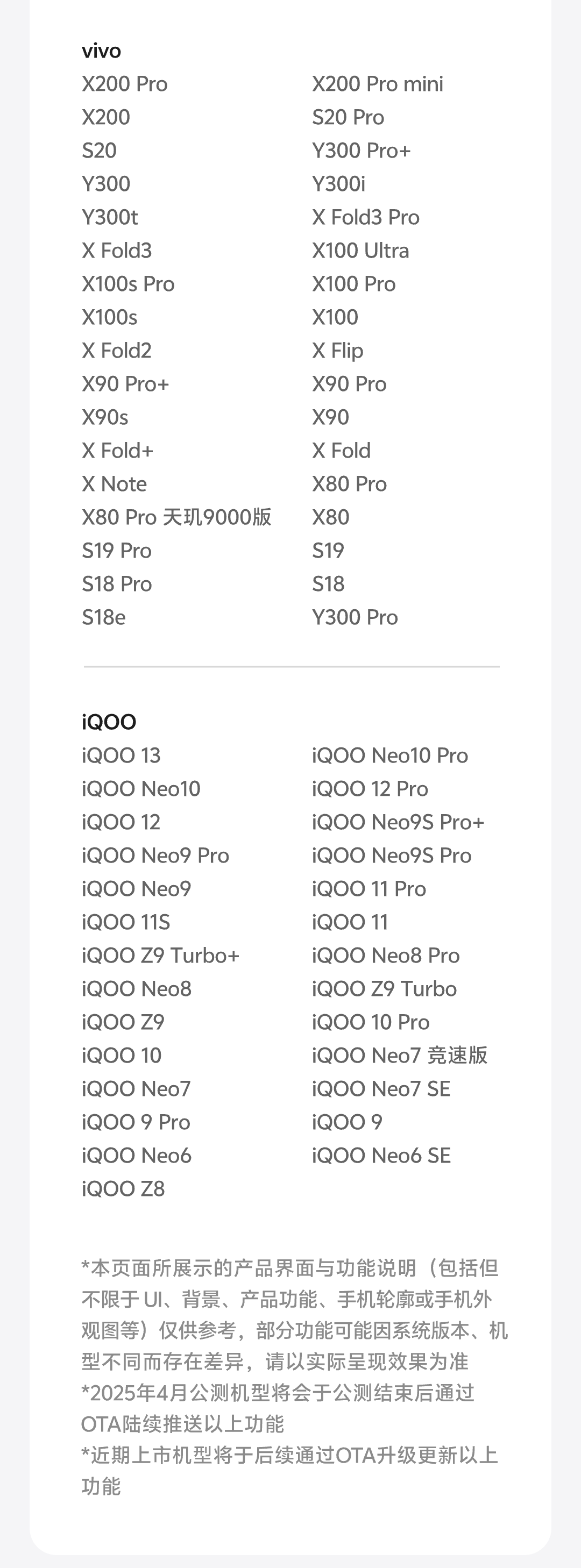 以上功能已于 3 月 27 日起开始陆续推送,4 月底前完成推送,分批覆盖 OriginOS 5 用户,IT之家附升级名单如下: