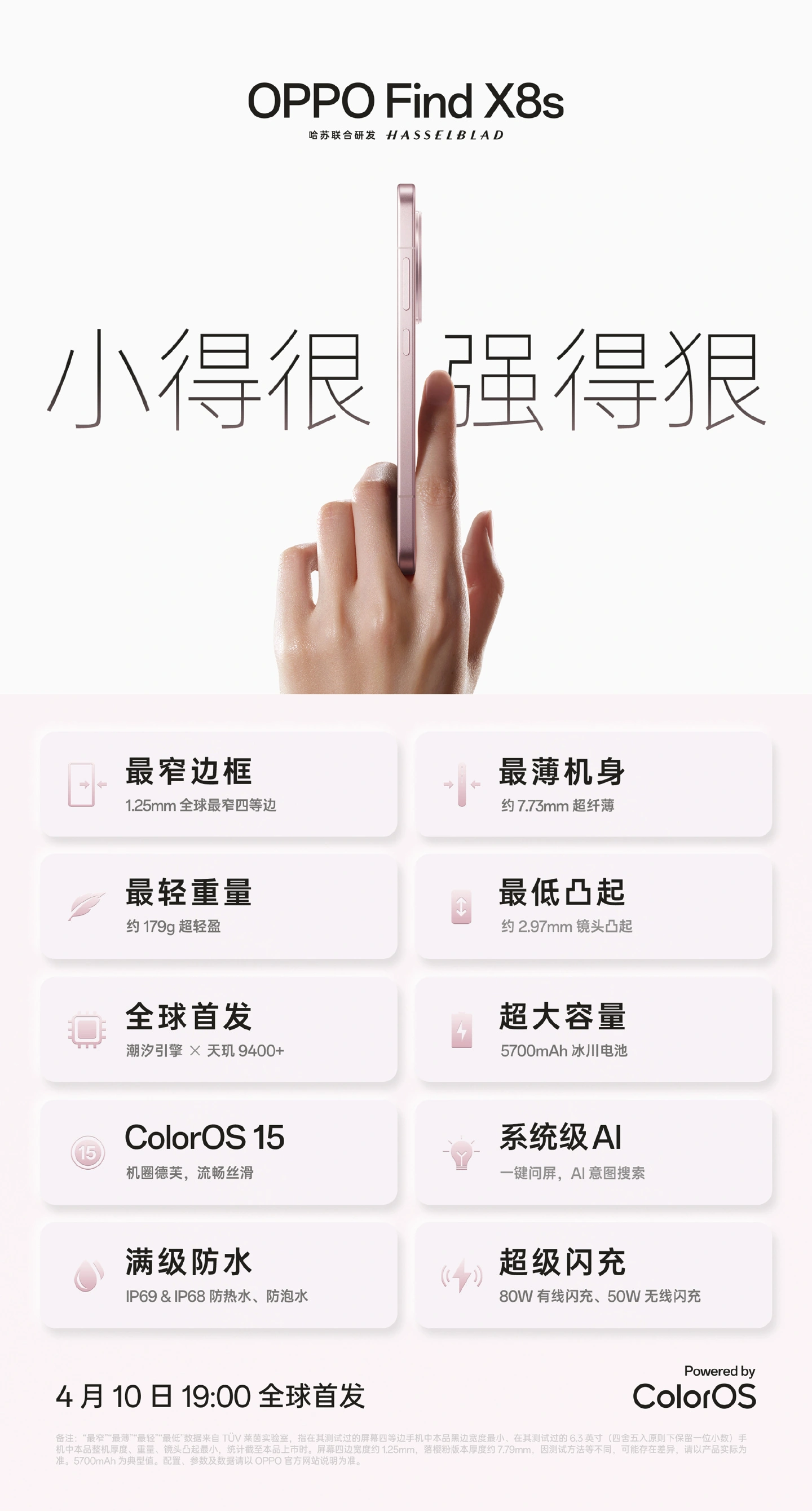 IT之家 3 月 30 日消息,OPPO 今日发布一张海报,总结了 OPPO Find X8s 轻薄小直屏手机的主要规格,新机将于 4 月 10 日 19:00 全球首发。