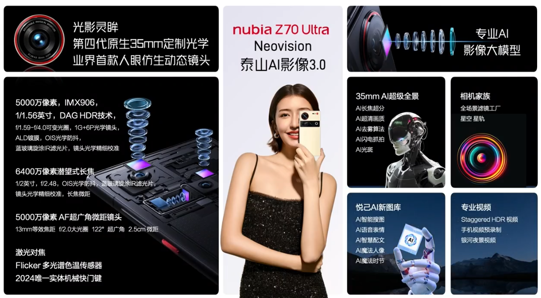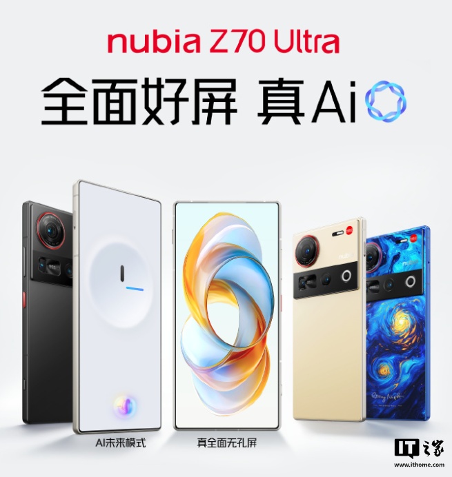 努比亚 Z70 Ultra 旗舰手机于 2024 年 11 月 21 日正式发布,延续了屏下前摄“真全面屏”设计,搭载最新骁龙 8 至尊版及 LPDDR5X + UFS4.0,定价 4599 元起。