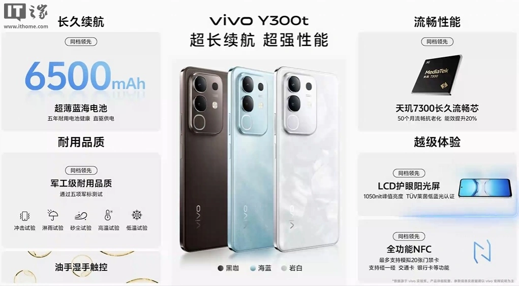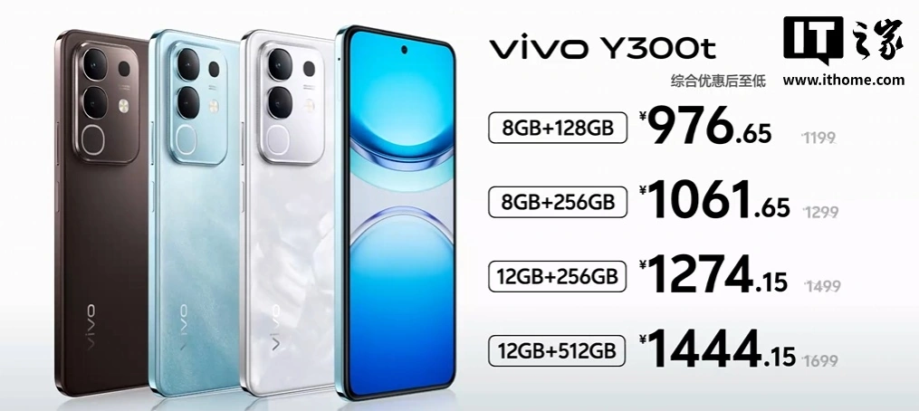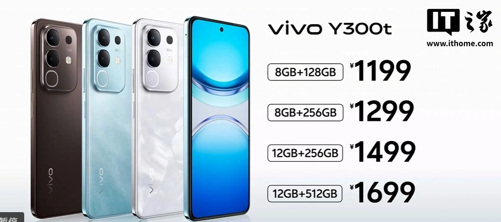 IT之家 3 月 31 日消息,vivo Y300t 手机今日正式发布,新机搭载天玑 7300 处理器、内置 6500mAh 超薄蓝海电池,1199 元起。