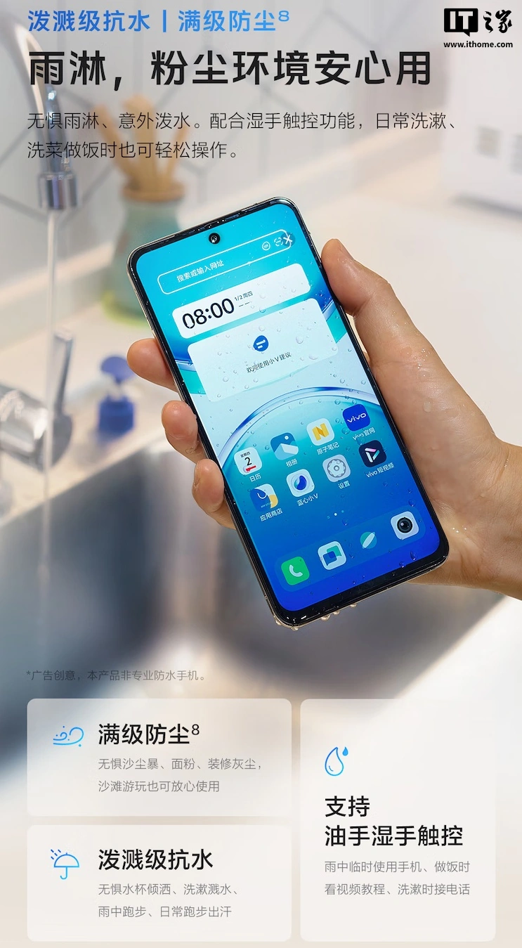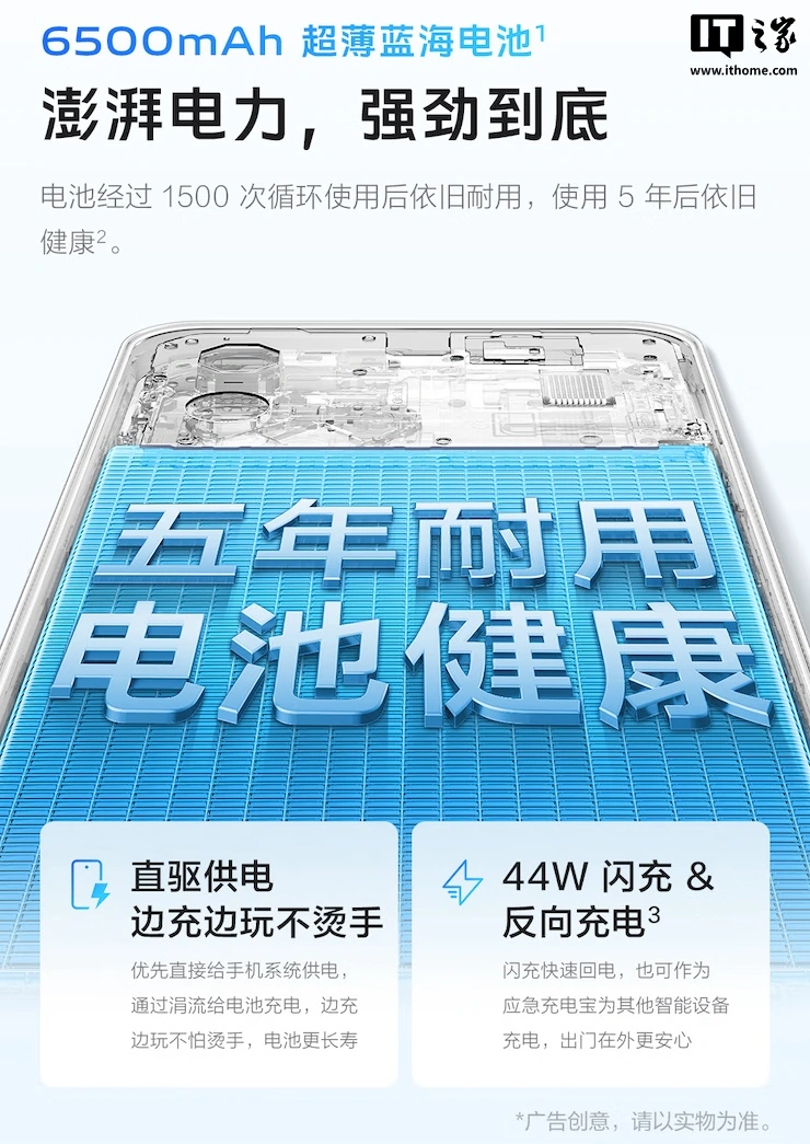 新机内置 6500mAh 超薄蓝海电池,支持 44W 闪充,号称 5 年耐用。该机还采用磐石抗摔结构,支持泼溅级抗水 / 满级防尘 / 油手湿手触控,同时通过冲击 / 淋雨 / 砂尘 / 高温 / 低温 5 项军标测试。