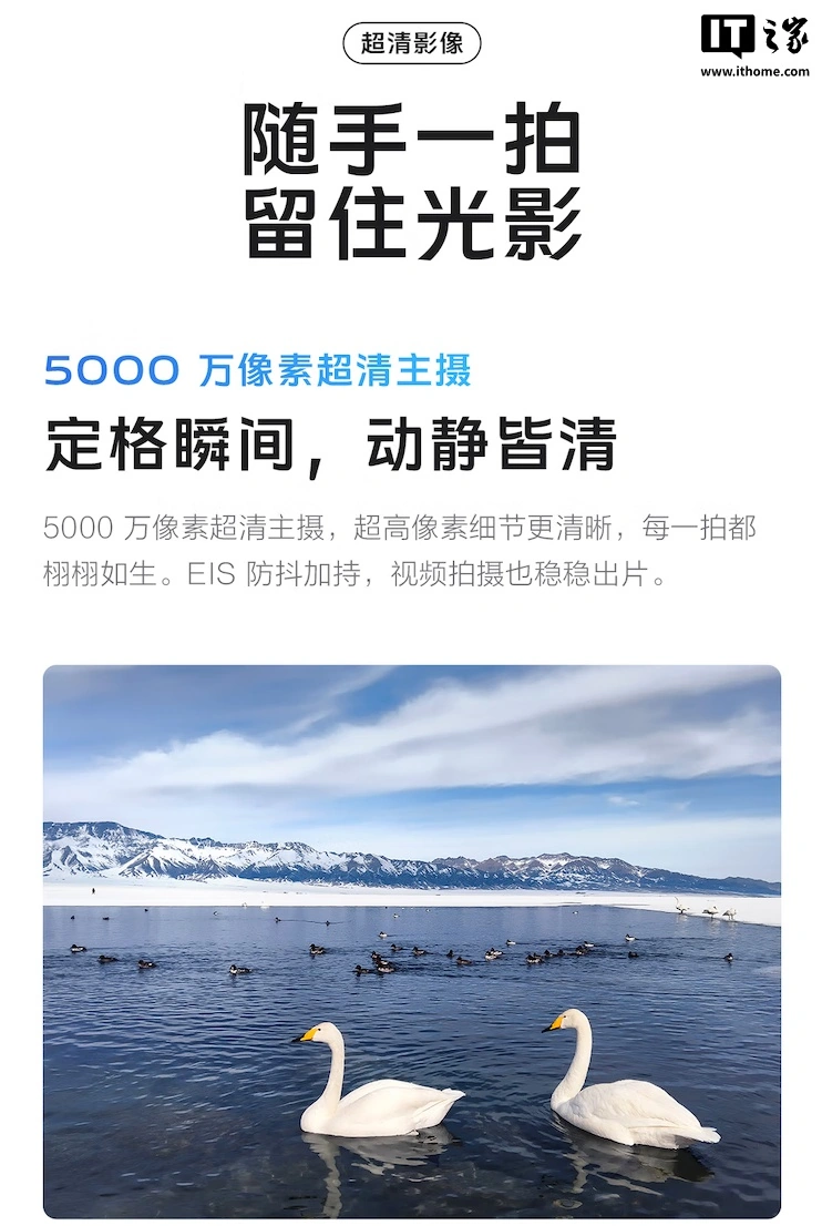 vivo Y300t 还配备 LCD 护眼阳光屏,支持 1050nits 全局激发亮度 / TUV 莱茵低蓝光认证。新机后置 5000 万像素主摄(EIS 防抖),支持超级夜景、AI 一键消除、动态照片等功能。