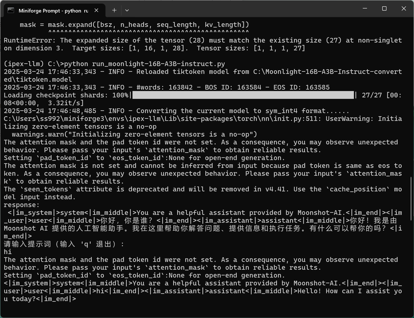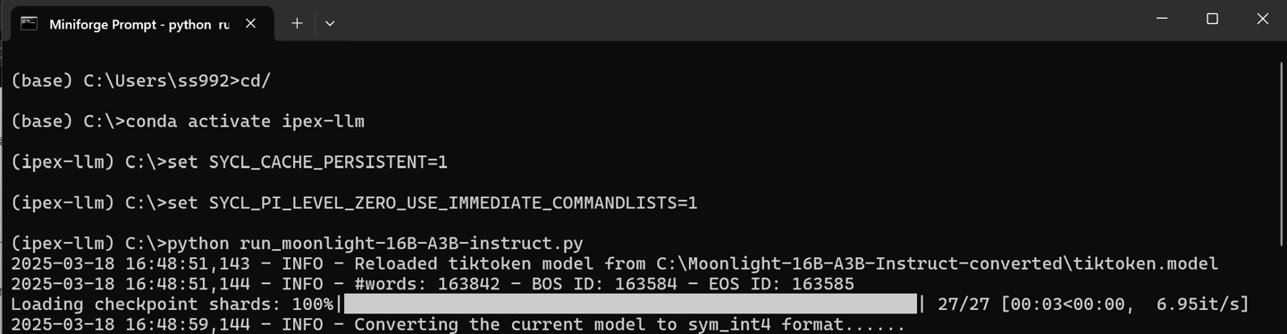 conda activate ipex-llmset SYCL_CACHE_PERSISTENT=1set SYCL_PI_LEVEL_ZERO_USE_IMMEDIATE_COMMANDLISTS=1python run_moonlight-16B-A3B-instruct.py