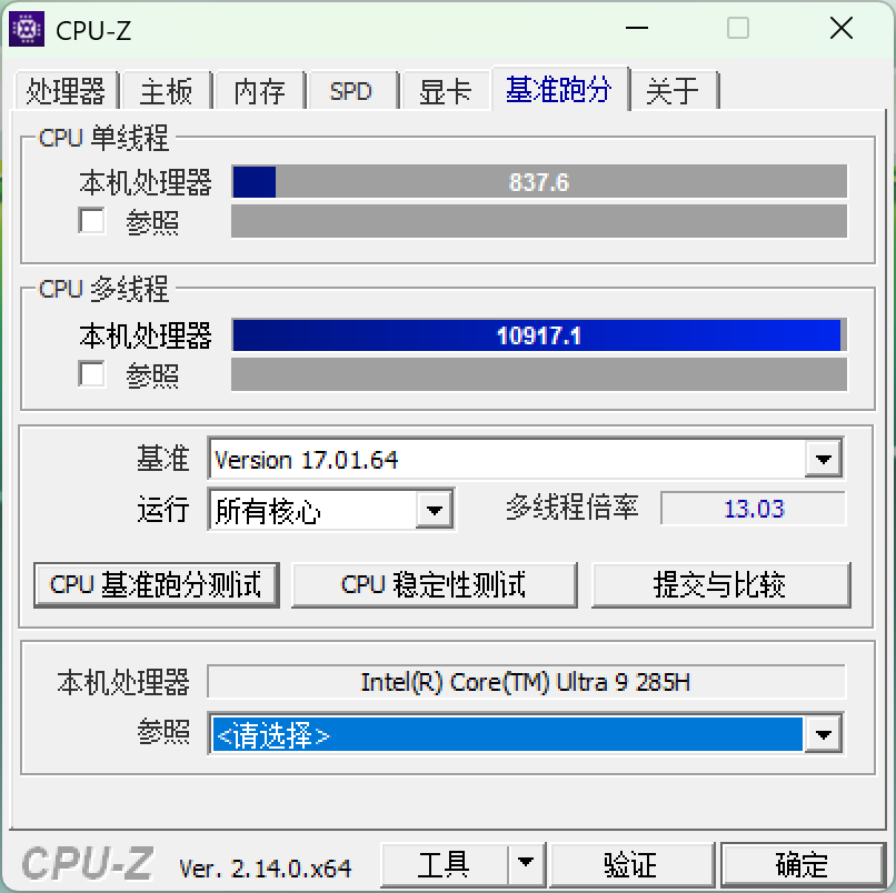 CPU-Z 单核 837.6 分,多核 10917.1 分。