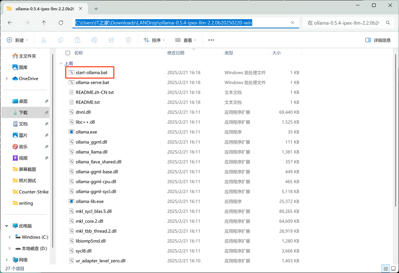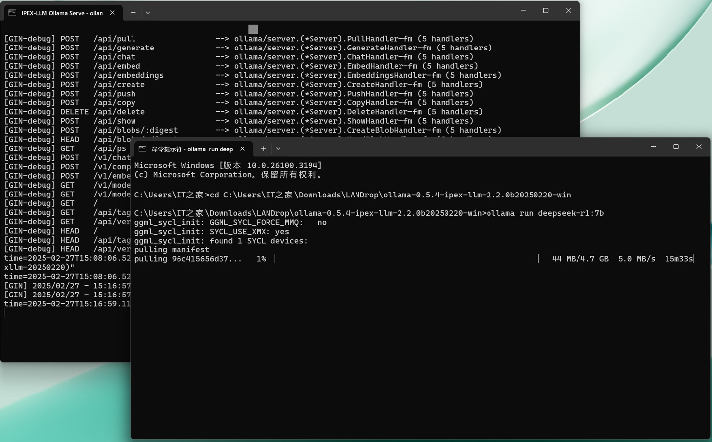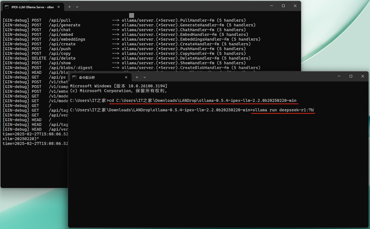 cd CUsersIT之家 DownloadsLANDropollama-0.5.4-ipex-llm-2.2.0b20250220-win ollama run deepseek-r1:7b