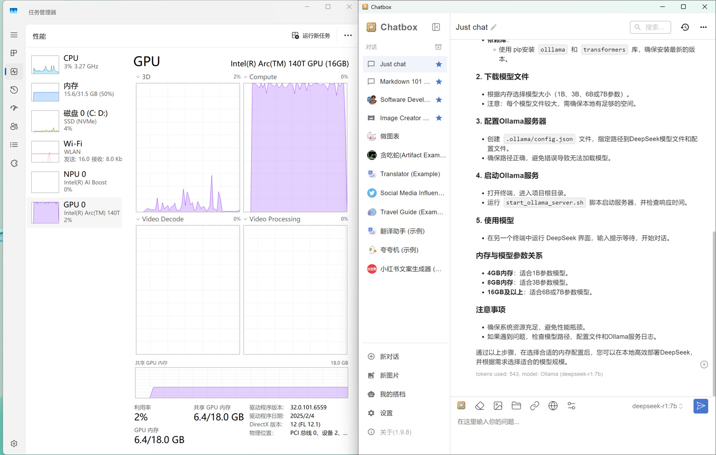 选好后就可以开始对话啦,提问后同样可以看到,调用的依旧是刚才部署的本地模型,依旧会跑满 Arc 核显的计算模块进行加速。
