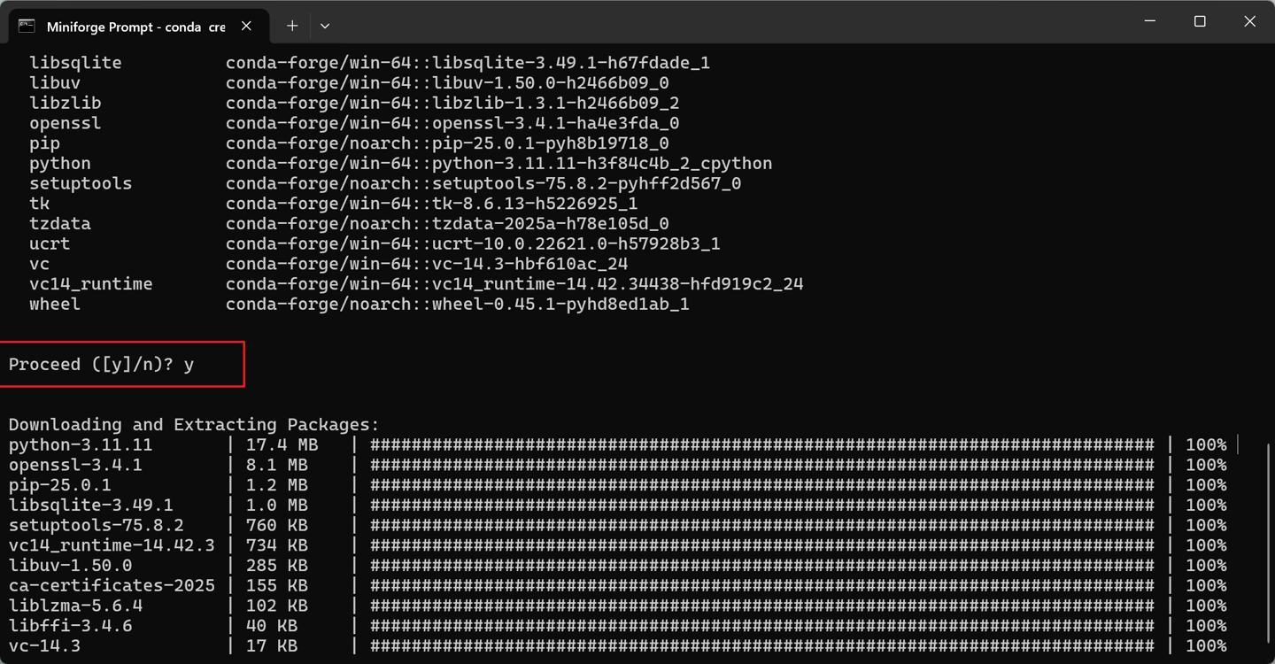 下载完成后,运行下列代码(在提示 y / n 时输入 y 并回车确认):