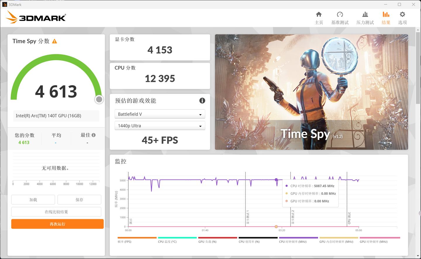 3DMark Time Spy CPU 分数 12395 分,显卡分数 4153 分。