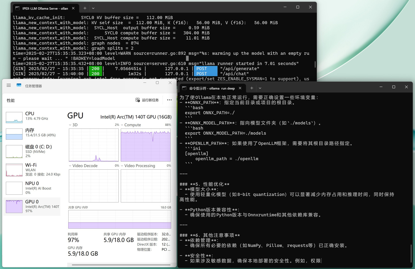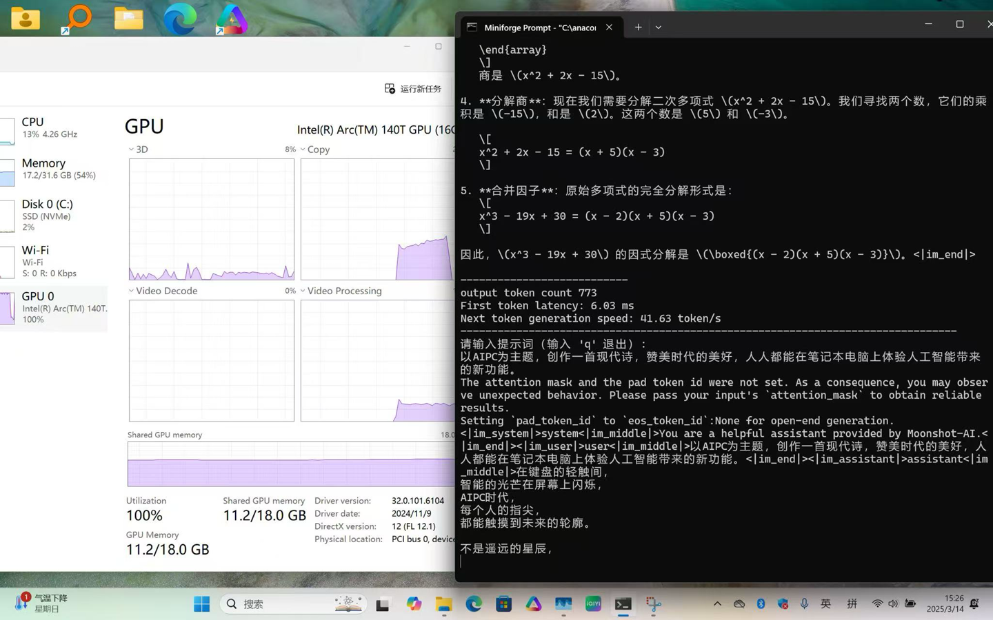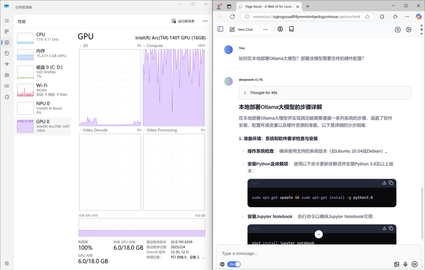 这次的问答界面就友好多了,并且基于大家每天都要使用的浏览器,方便快捷。提问后从系统资源管理器能够看到,本地 Arc 核显的计算模块已经被调用进行加速。