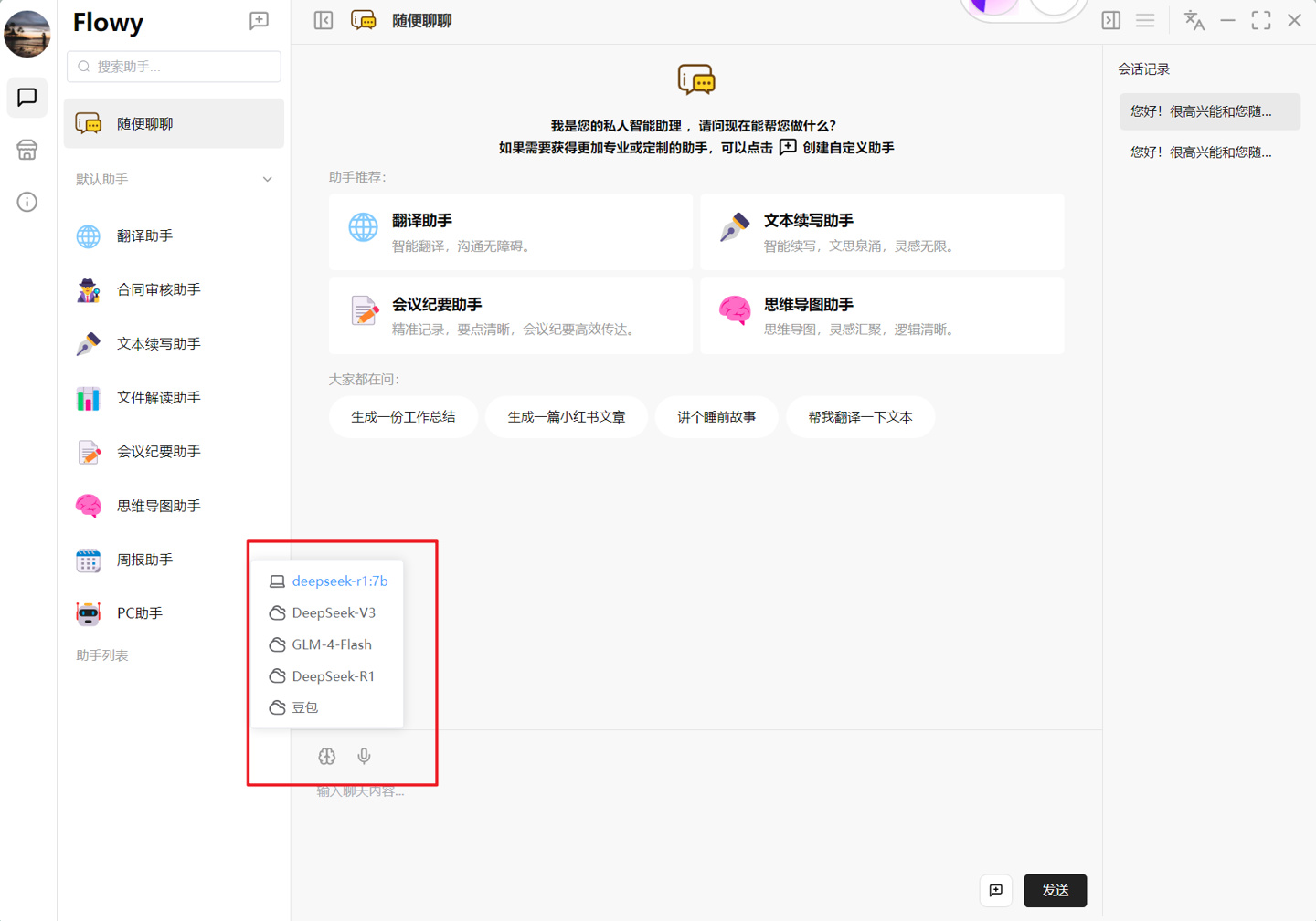下载完成后,回到主界面就可以选择模型开始对话了,这里需要注意的是,除了本地模型,Flowy AIPC 助手还提供了云端模型可选,选择的时候要注意区分前面的小图标,分辨本地模型和云端模型。