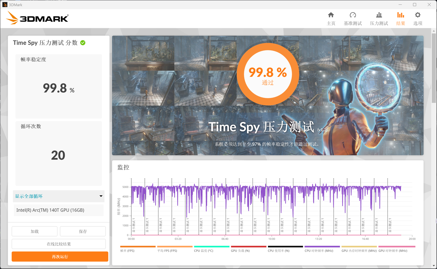 Time Spy 压力测试 20 轮循环稳定度 99.8%。