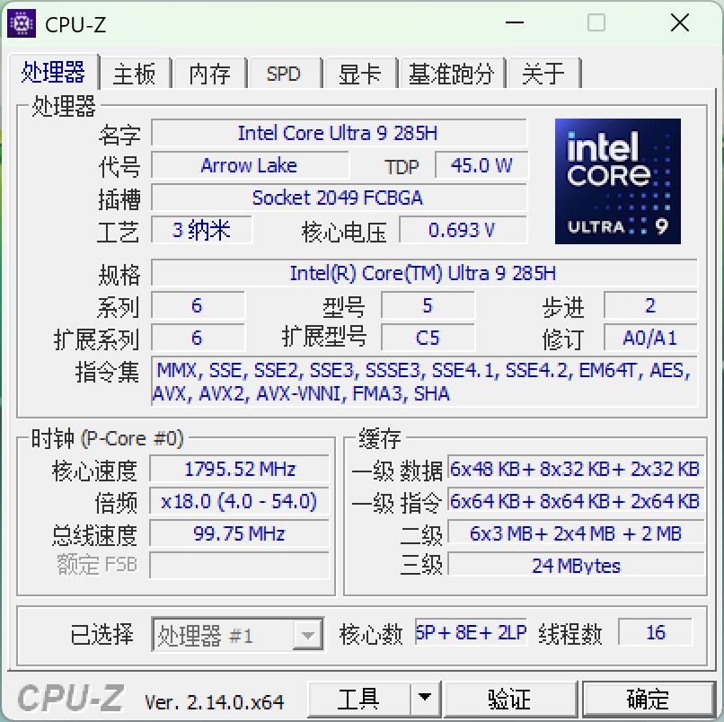 测试使用的笔记本为 Intel Core Ultra 9 285H 处理器,TDP 45W。