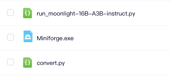 完成后,将【C:Moonlight-16B-A3B-Instruct】中的所有⽂件复制⾄【C:Moonlight-16B-A3B-Instruct-converted】内,并在提⽰存在重复⽂件时跳过所有重复⽂件。