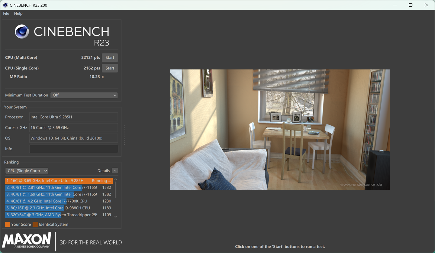 Cinebench R23 单核 2162 分,多核 22121 分。