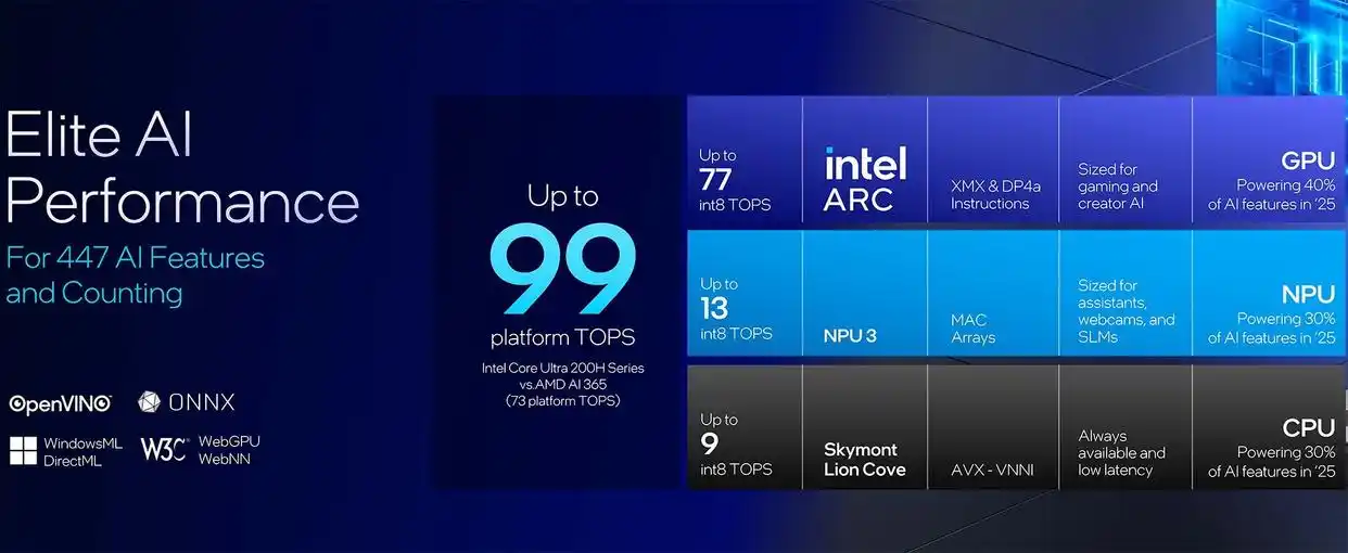 对于在大模型的应用方面,英特尔 ® 酷睿™ Ultra200H 系列处理器的 GPU 集成了 Xe 架构,AI 算力显著提升,且其全系配备了独立 NPU,NPU 单元可提供高达 13 TOPS 的算力,通过 CPU+GPU+NPU 的协同计算,全平台总算力达到 99 TOPS,并且原生支持英特尔 OpenVINO 工具套件,这也让本文所说的“在个人 PC 上本地部署 AI 大模型”成为了可能。