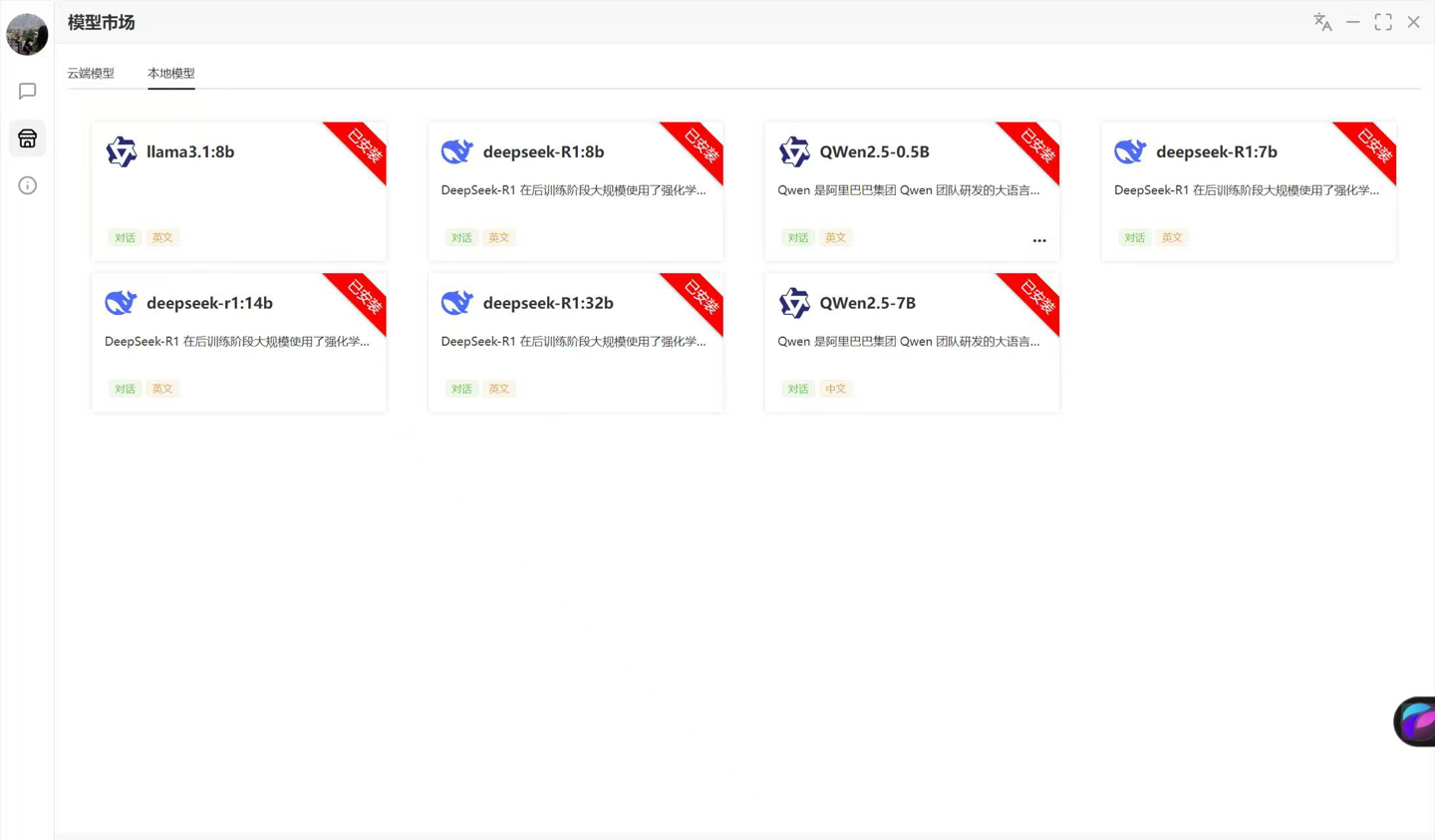 在左侧选择模型市场,可以看到提供了多个模型可选,前文部署好的 deepseek-R1:7b 模型已经识别出来并显示为已安装,如果没有部署过,就可以在这里直接点击下载。