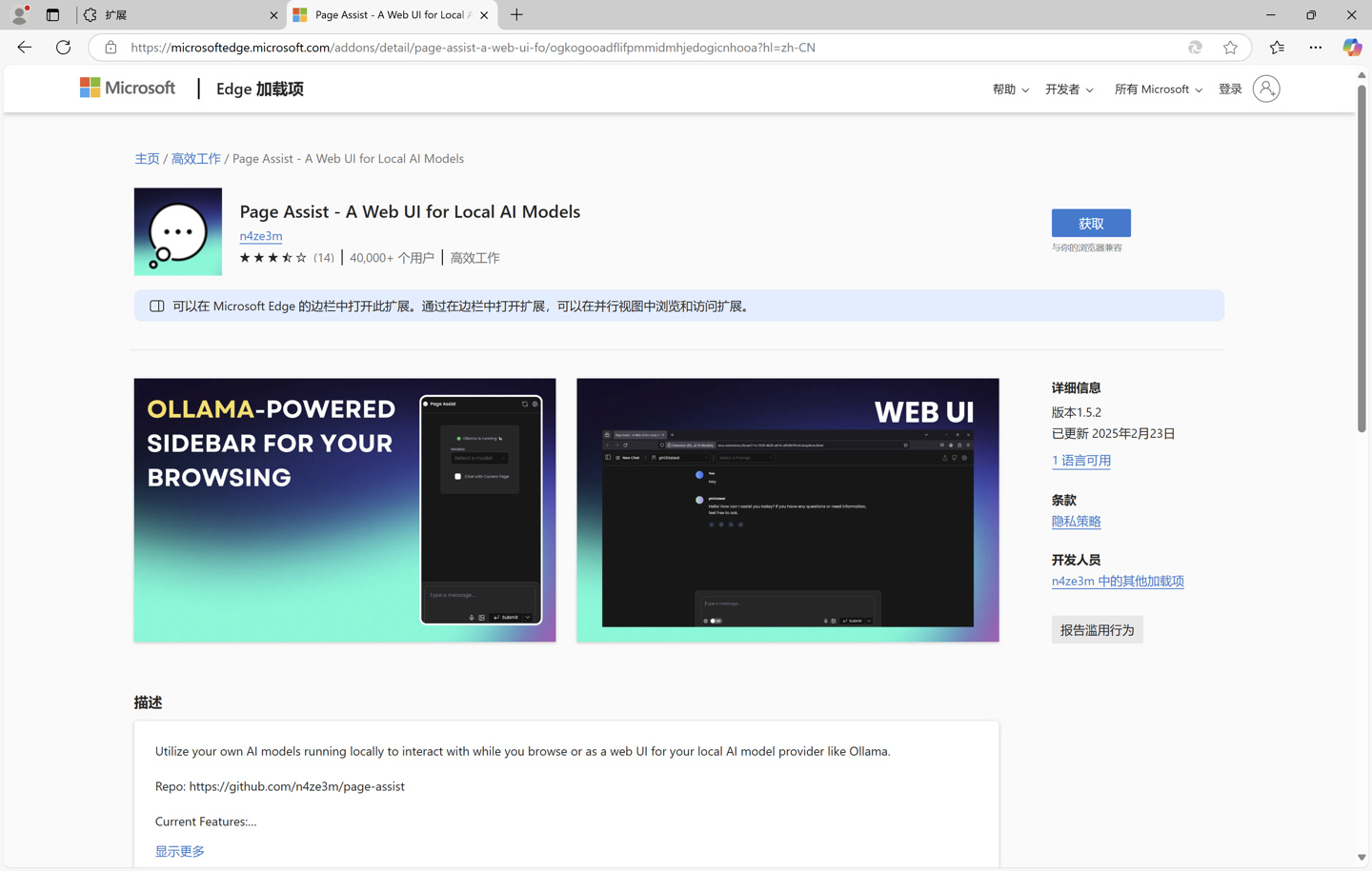 前文说过,基于 Ollama 的大模型有三种交互方式,分别是命令行、浏览器插件和独立 App,接下来我们就说说后面的两种方式。使用 Edge 浏览器和 Chrome 浏览器的小伙伴,可以到扩展中找到 Page Assist 这个插件
