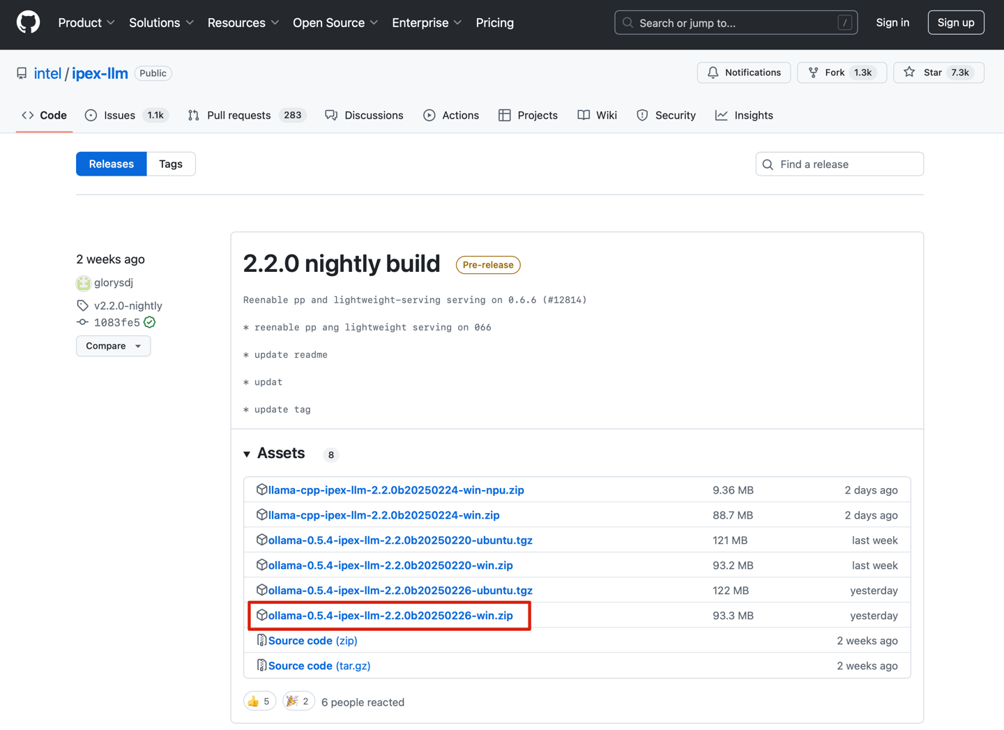 接下来就是下载 Intel 优化版 Ollama+IPEX-LLM 文件了,文件不大,可以自行到 GitHub 下载。