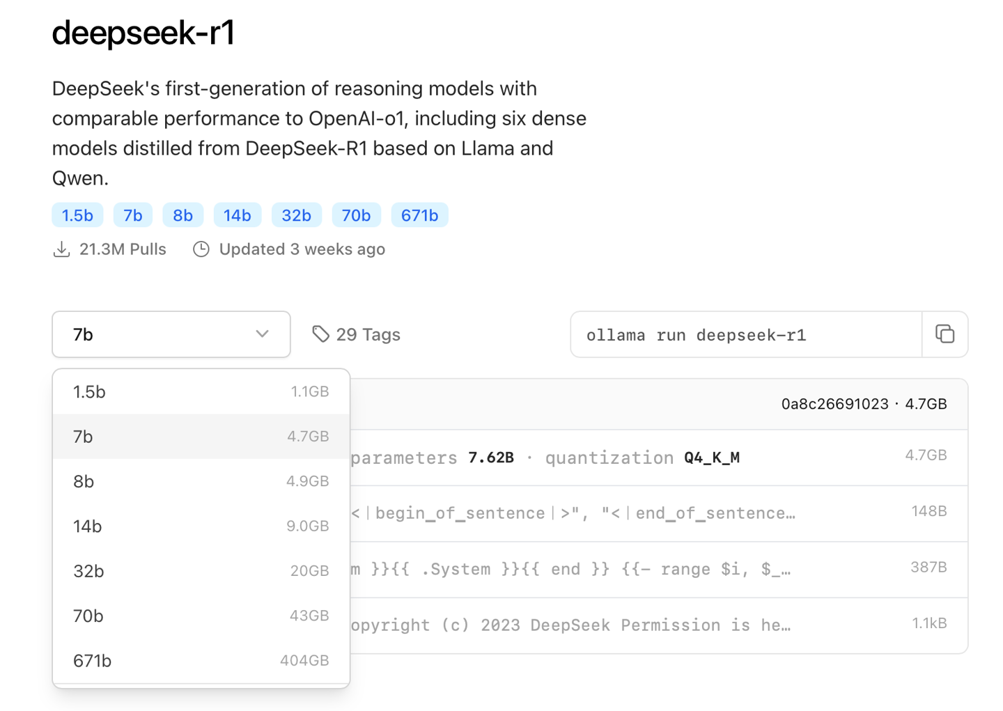 这里第二条命令中 deepseek-r1:7b 最后的 7b 指的就是所选的模型规模了,下面附上不同规模模型的文件大小,个人电脑建议大家部署 14b 以下的模型,此处小编所使用的电脑显存为 16GB,选择 7b 模型,供大家参考。