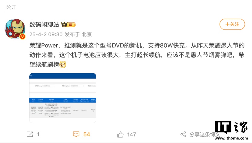 IT之家 4 月 2 日消息,荣耀 Power 入网信息曝光,引发热议。今日,数码博主 @数码闲聊站信息爆料,荣耀 Power,应该就是入网型号“DVD”,最大充电功率 80W。从昨天荣耀愚人节的动作来看,荣耀 Power 的电池应该很大,也直接实锤了这款待发新品。华为 P 系列改叫 Pura,荣耀随后出个 Power 系列?