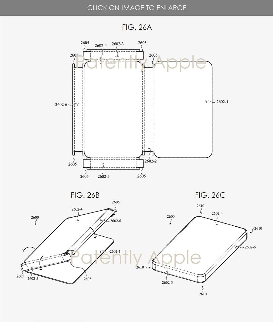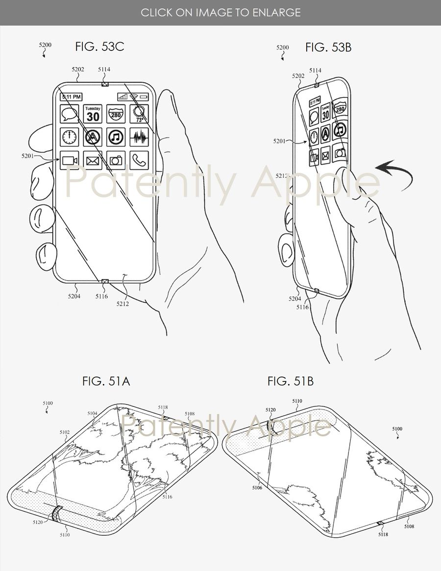 专利图示披露了多项创新设计:图 26A-26C 展示六面透明棱柱外壳,每面均可独立显示内容;图 53B-C 演示手机翻转时,界面会智能迁移至用户正对屏幕;图 51A-B 则呈现了画面从正面延伸至背部的 “穿透显示” 效果。