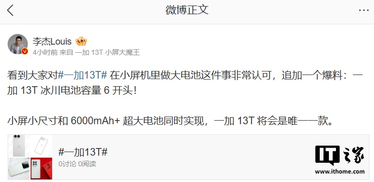 文章来源于互联网:IT之家-小尺寸 + 大电池同时实现,一加 13T 手机电池容量超 6000mAh