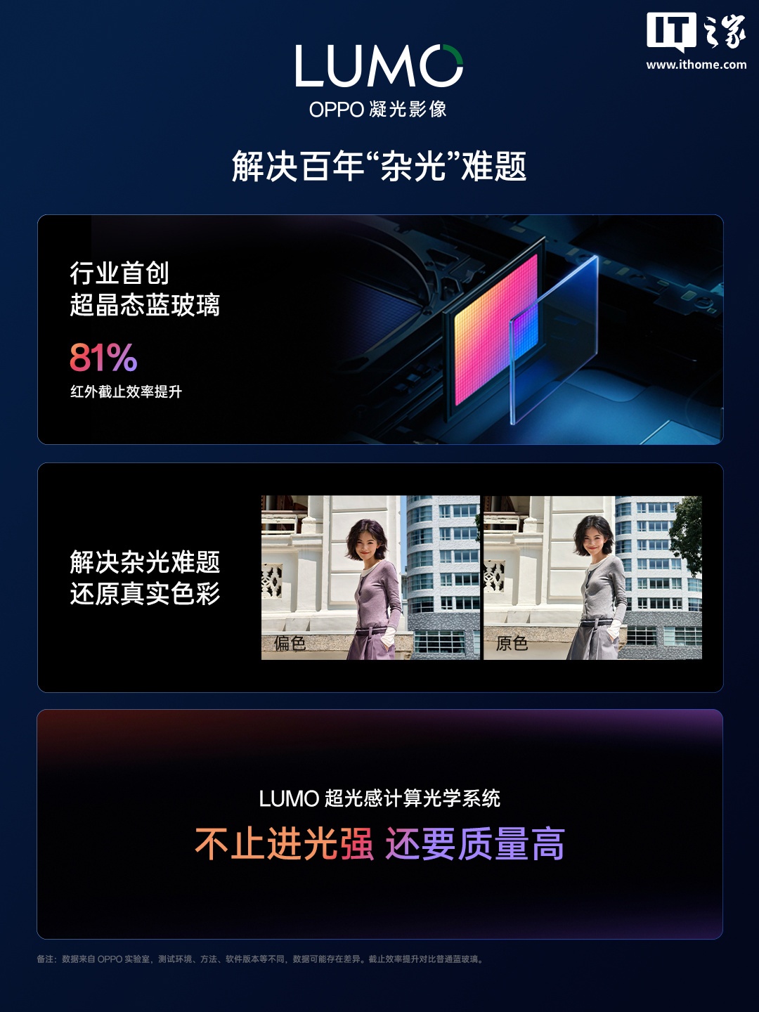 另外,OPPO LUMO 凝光影像系统采用行业首创超晶态蓝玻璃,号称“解决百年‘杂光’难题,让红外截止效率提升 81%”。