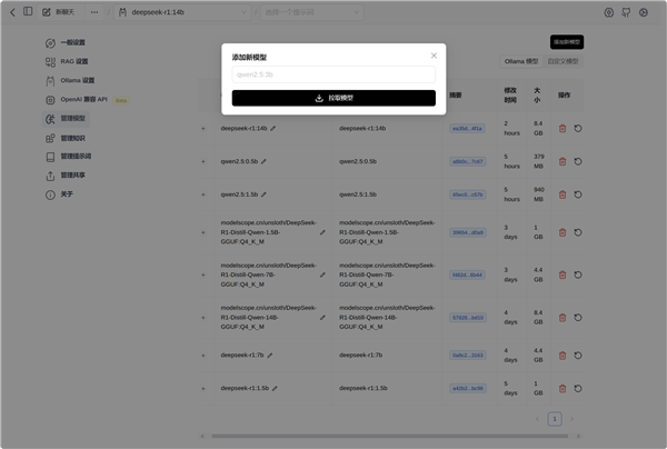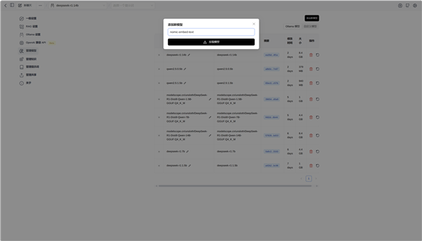 也可以点击添加新模型,然后在弹出窗口中输入模型名称,点击拉取模型,就可以开始下载。