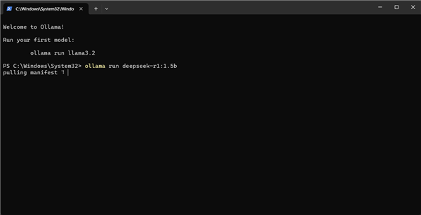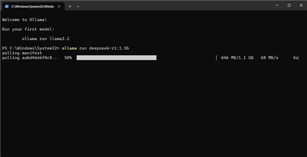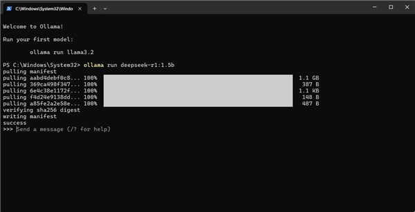 可以看到模型下载速度相当快,应该是使用了国内的镜像站,Deepseek-R1:1.5B模型只有1.1GB的大小,很快就可以完成下载开始运行。
