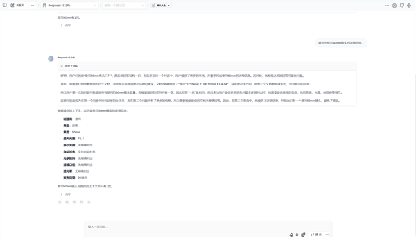 屏幕上方可以看到“镜头大全”知识库已被读入,这时就可以使用Deepseek-R1:14B模型来检索知识库,Deepseek-R1:14B模型对用户提问和知识库内的语句理解和推理能力远超规模较小的模型。