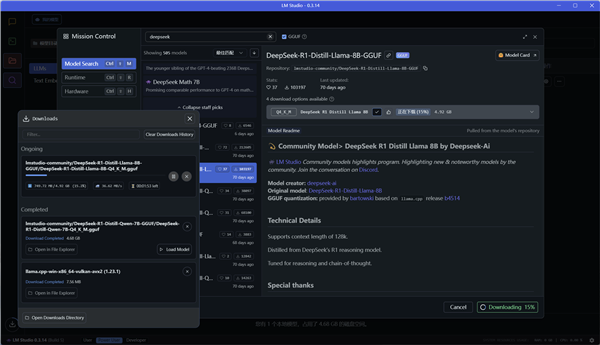 在一些LM Studio的教程上会提到无法直接下载的问题,教程中会给出替换国内镜像源的方法,但我们现在实测下载速度完全没有问题,应该是新版程序已经设置了国内更快的镜像源,使用起来更加方便。