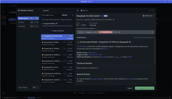 一些没有经过蒸馏的巨大模型也在其中,比如Deepseek-V3模型,体积高达347GB,LM Studio也会提示对于本机来说可能过大无法顺利运行。