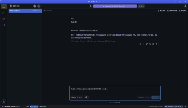 下载完毕之后,我们就可以在命令行中开始和Deepseek进行对话了。