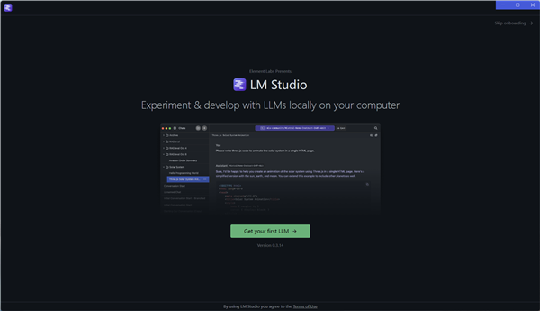 安装完成之后,LM Studio就会引导用户下载第一个本地AI大模型,如果不需要默认推荐的模型,也可以点击右上角的跳过按钮来取消下载。
