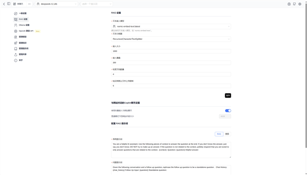 我们在Page Assist插件中,找到RAG设置,在文本嵌入模型处选择刚刚下载的nomic-embed-text,就完成了建立本地知识库的前期准备工作,除了Page Assist插件外,也有其它可以支持建立本地知识库的AI大模型工具,操作方法也都类似。