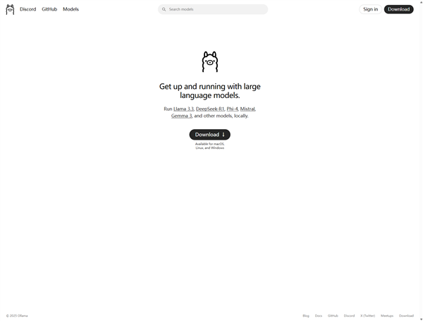作为一个开源免费的部署工具,Ollama的主页做的非常简洁,用户只需要点击Download按钮就可以下载到最新的安装程序。