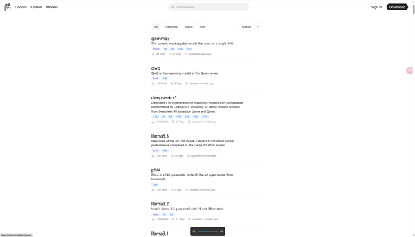 所有可下载的模型列表,都可以在Ollama网站找到。