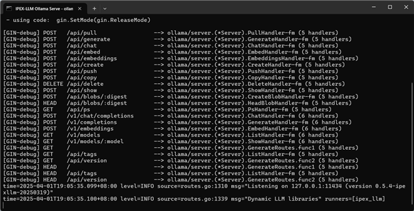 在解压目录中找到“start-ollama.bat”批处理文件,双击运行,启动Intel优化版Ollama服务,此时就和官方版Ollama运行效果一致,唯一需要注意的即使Ollama服务启用时,会有一个命令行窗口,不要意外关闭,关闭这个命令行窗口就会关闭Ollama服务。