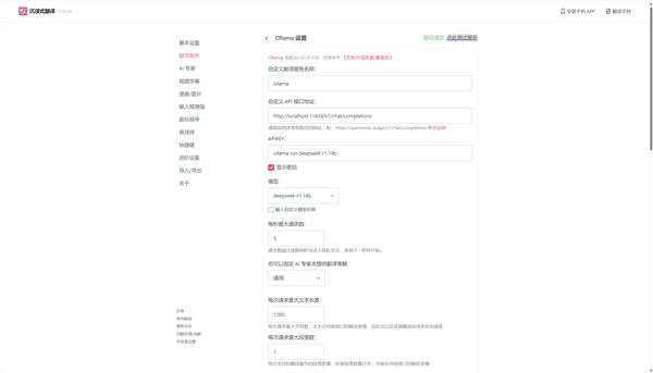 显示绿色的验证成功,就代表我们配置的本地AI大模型翻译服务已经上线可以工作了。