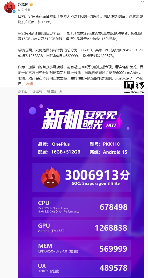 文章来源于互联网:IT之家-OnePlus PKX110 新机现身安兔兔:超 300 万分、16GB+512GB 规格,预计为一加 13T