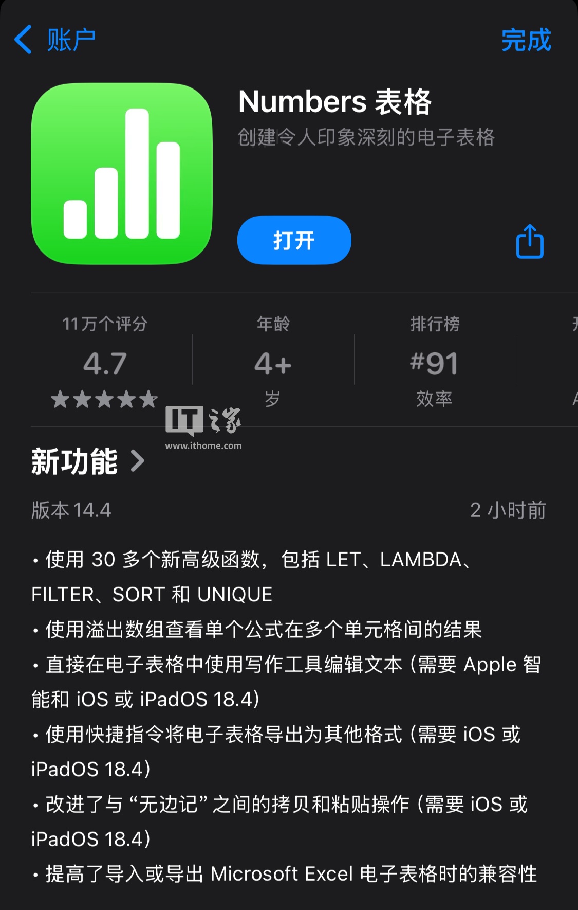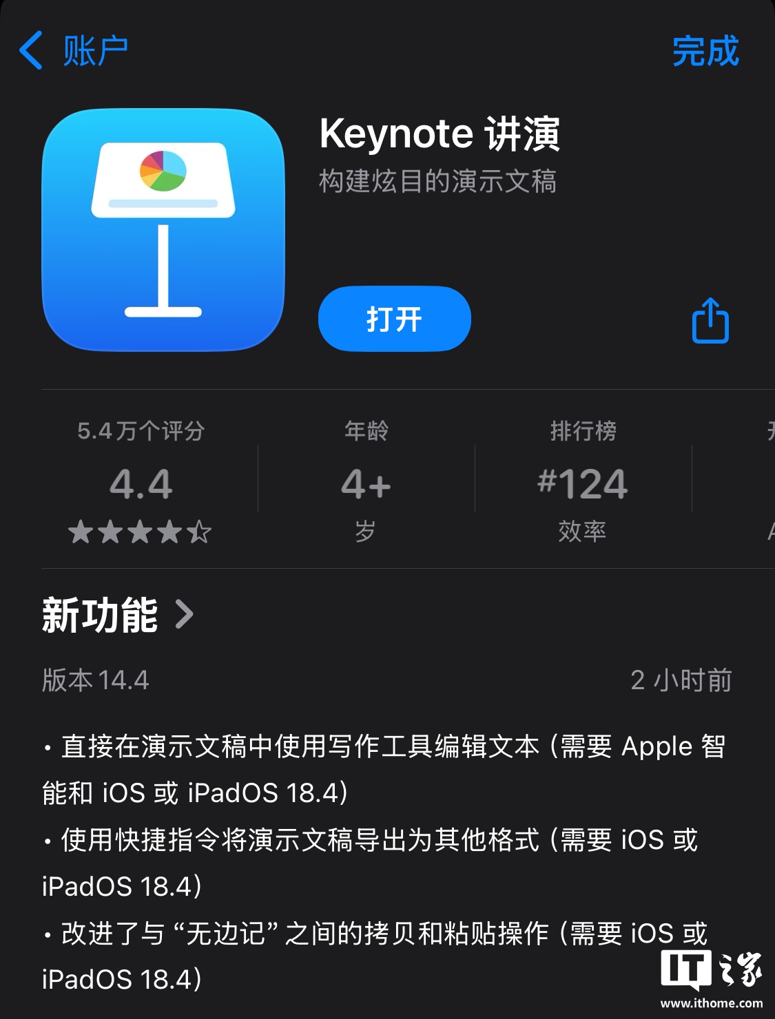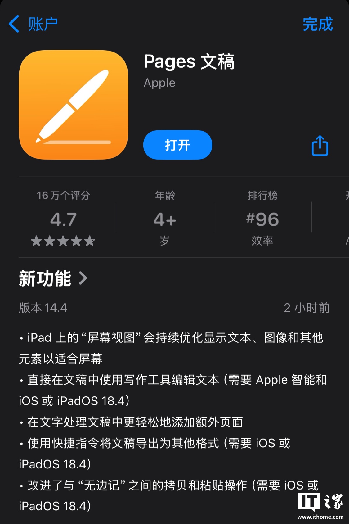 IT之家 4 月 4 日消息,苹果 iOS / iPadOS 18.4 正式版于 4 月 1 日发布,随后,苹果在今日更新了 iWork 办公套件,带来了多项 iOS 18.4、iPadOS 18.4 或 macOS 15.4 系统专属功能,IT之家附更新内容如下: