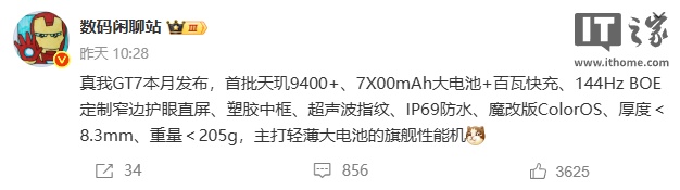 文章来源于互联网:IT之家-realme 真我 GT7 手机入网:天玑 9400+ 搭配超 7000mAh 大电池,本月发布