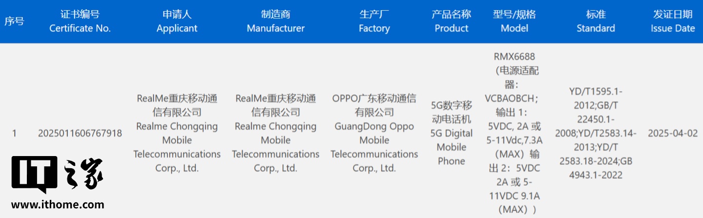 IT之家 4 月 4 日消息,一款型号为 RMX6688 的 realme 新机于 4 月 2 日通过了国内 3C 认证,支持 100W 快充,预计为本月即将发布的真我 GT7 手机。
